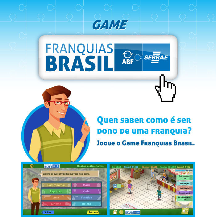 Iniciativa conjunta da ABF e do SEBRAE, o Game Franquias Brasil é um meio fácil, cômodo e divertido de viver a experiência de comandar uma franquia e ser dono do próprio negócio.