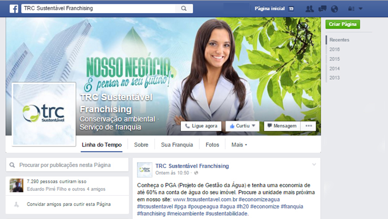 A rede TRC Sustentável trabalha com projetos de gestão da água, cada residência, empresa ou condomínio pode atingir uma economia de até 60% no consumo do líquido. Uma economia inteligente e sustentável atinge cada vez mais pessoas, e a rede de franquias enxergou nas mídias digitais uma forma da mensagem chegar até o cliente de forma direta. “Hoje em dia acredito que as redes sociais vieram a ser a primeira fonte de contato do cliente com a empresa, é possível o cliente ter um briefing sobre o que é a empresa e com que ela trabalha. Uma ferramenta eficiente com custo de manutenção baixo”, finaliza Anderson.