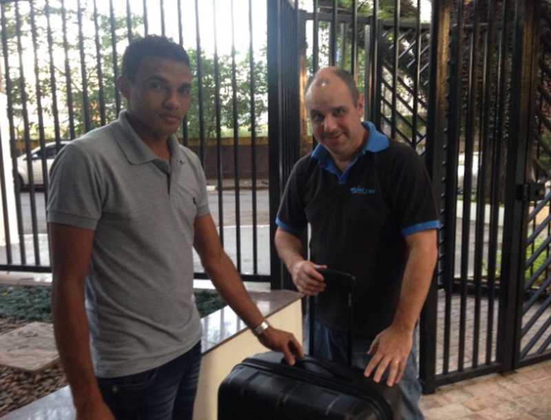 O empresário Domingos Coppio (à dir.) leva mala alugada até a casa do cliente.